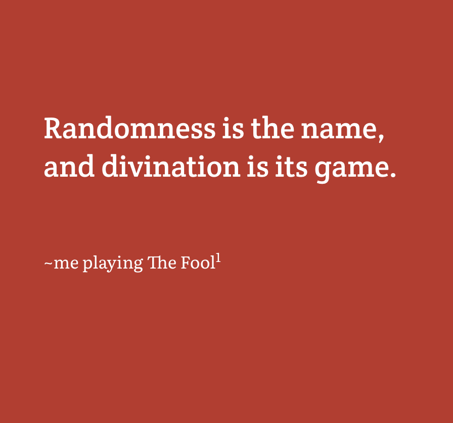 Creativity Making an oracle by machine Get a reading of sorts at bottom of this page. Randomness is the name, and divination is the game. ~Playing The Fool1 I just added a Random Post… January 25, 2025February 11, 2025 · 3 min read